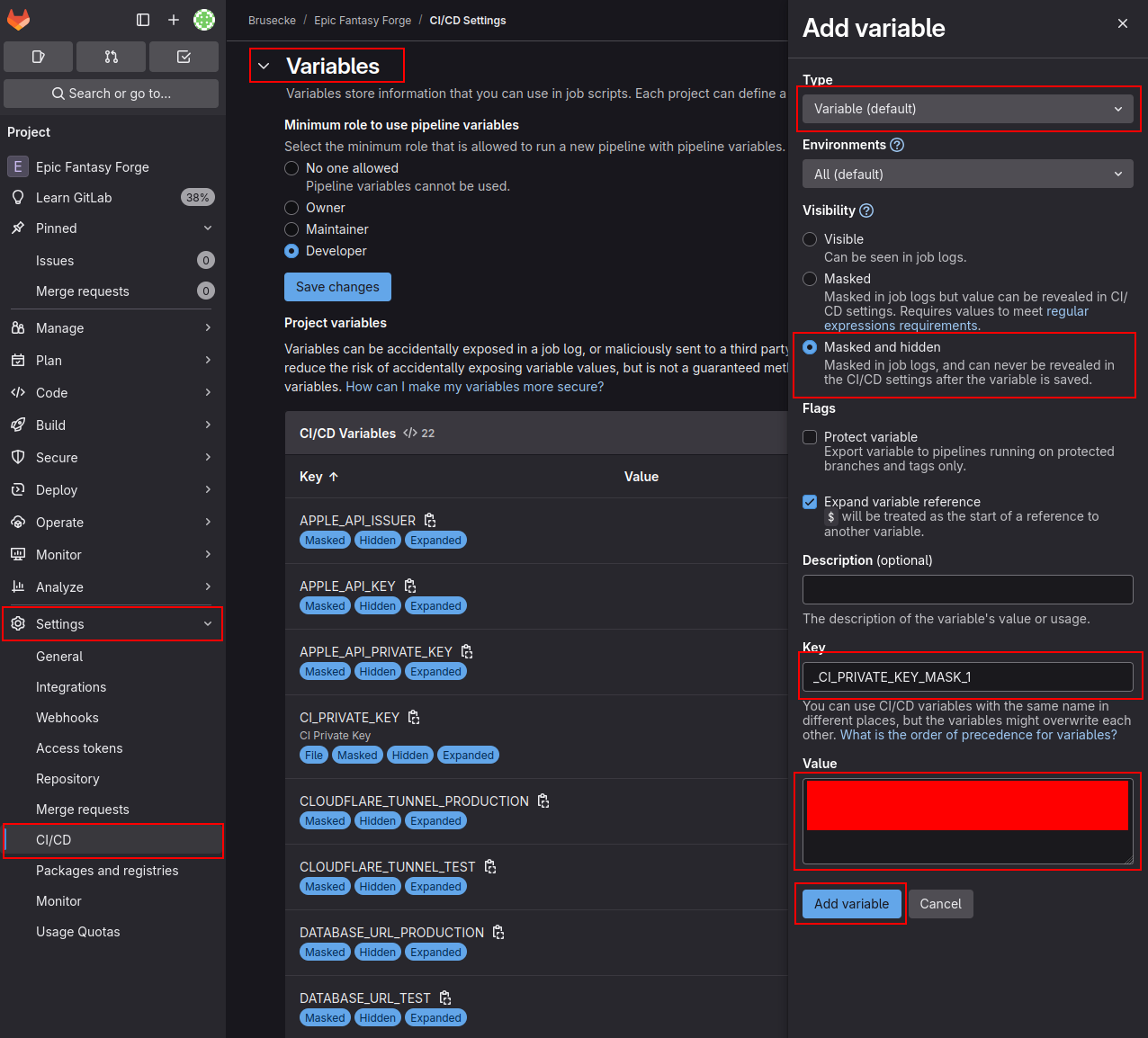 Remember to set the "Visibility" of your CI variable to "Masked and hidden". Then create another CI variable named "CI_PRIVATE_KEY_MASK_2" and populate it with the second line from the private key file. Repeat this until all lines in the private key file are covered (skipping the header and footer lines). Finally you should have several masked CI variables protecting substrings of your private key: